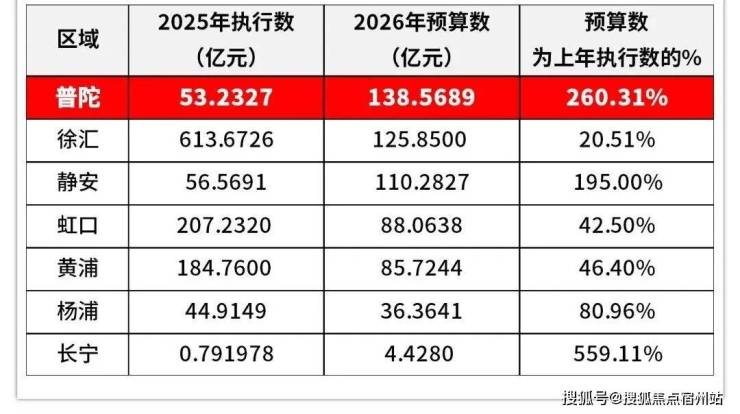 其次,2026年普陀拆迁与征地补偿预算高达约138亿,全市最高。