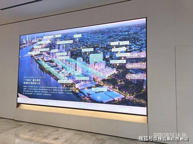 挑高8米的大堂堪称视觉盛宴,意大利进口雪花白大理石铺陈墙面,质感温润细腻;定制化水波纹金属屏风与顶部288盏水晶灯交相辉映,将黄浦江的粼粼波光定格为室内的璀璨星河。中央区域摆放的1:120比例全景沙盘,清晰呈现了约88万方超级TOD综合体的宏大布局,从高端住宅、稀缺别墅到合生汇商业广场、5A甲级写字楼、品牌酒店等多元业态,一目了然。更有360°全息投影设备,可直观拆解户型空间与智能化系统,让居住细节可视化、可感知。
