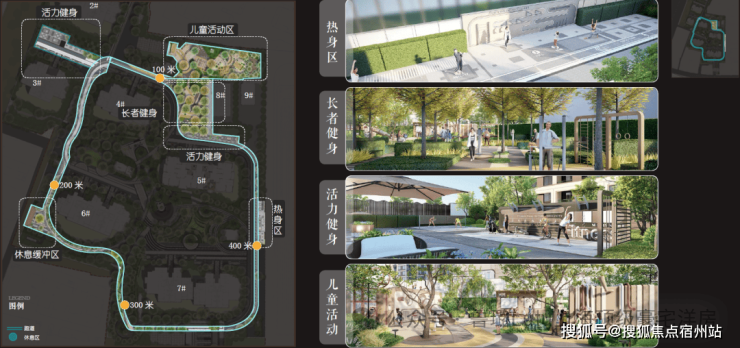 五大运动活力系统:热身区、定制主题儿童活动区、老年健身区、活力健身区和休憩缓冲区,并由约400M跑道串联;