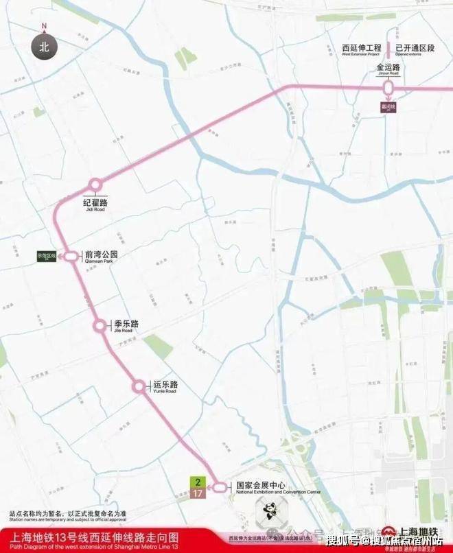 轨道交通13号线西延伸自13号线金运路站(不含)向西延伸,设车站5座。作为轨道交通市区网络的组成部分,通过与13号线先期工程的连接,为虹桥商务区与市中心、与浦东新区的联系开辟一条新的快捷路线,可以降低国家会展中心大客流压力,更好地提升虹桥地区轨道交通服务水平。