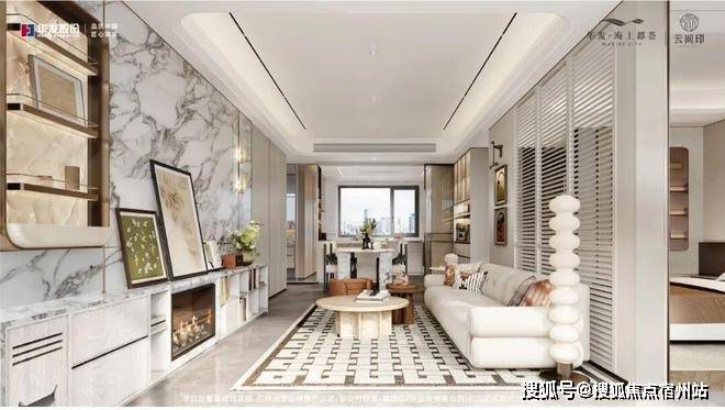 六重·澜亭之奢 ,约15米漂浮客厅。作为东赏水院灵韵,南望艺境连廊的观景中心,采用威尼斯棕岩板纹理,搭配金属、质感墙面,会客之中尽享艺术精粹尽显奢阔气度。成就高端私密会客的理想之境,融汇自然与艺术精粹。