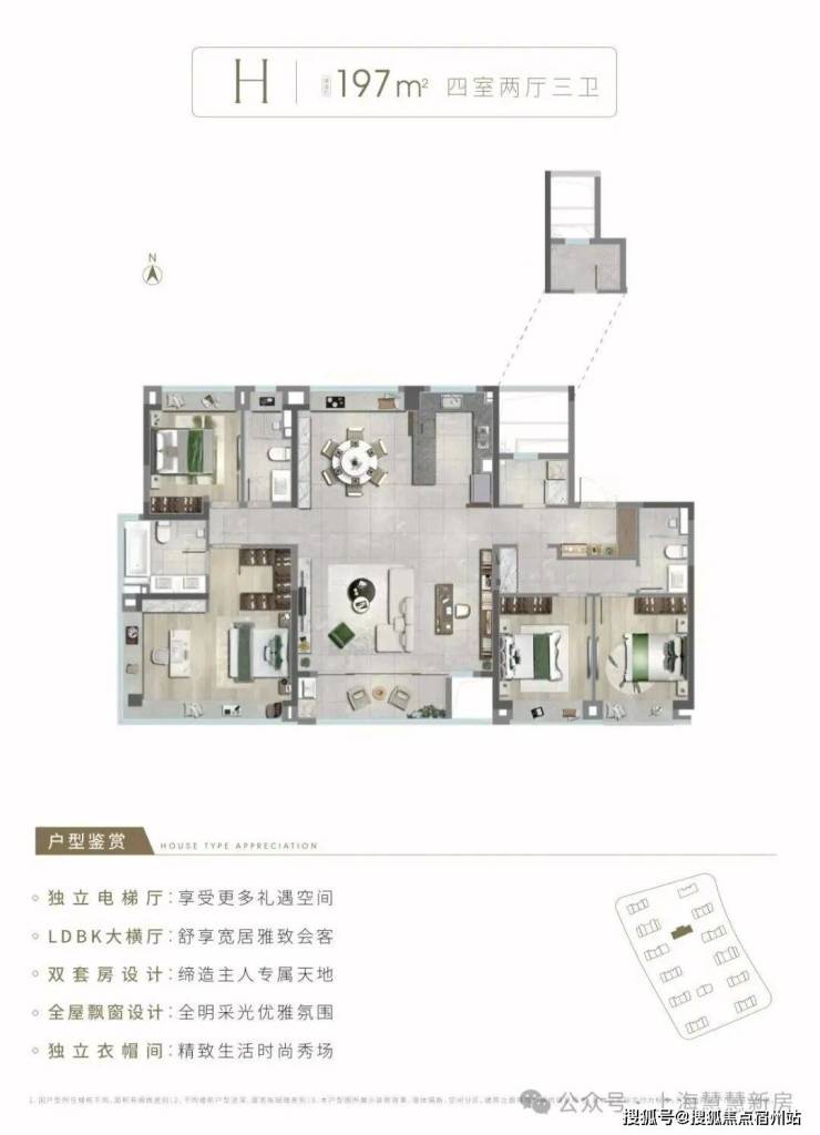 南向3.5面宽边厅的户型设计,一梯一户的电梯厅基本可以独享;客餐厅一体化设计,270°的超广视角,居住者足不出户就能坐拥长卷式观景体验;南向双套卧设置,实现精致而又尊奢的世家生活风范。