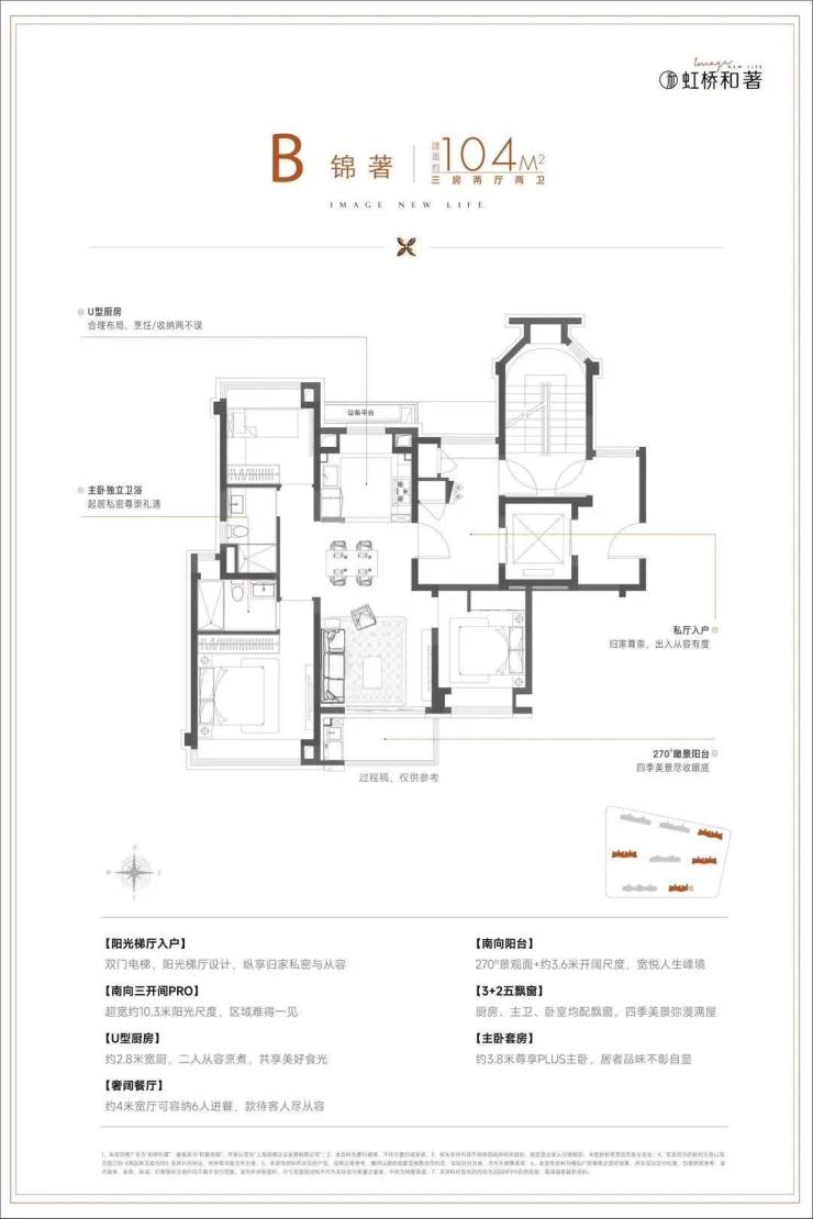 建面约104㎡3房,在建面94㎡小3房优点上,又进一步升级了尺度感,约10.3m的南向面宽,为室内带来了出众的采光面和尺度感,这个户型无论从实用性、尺度感,亦或是视野、采光、私密性来说,都做得相当优秀。☑️☑️保利虹桥和著售楼处电话:400 - 8377 - 020☑️☑️