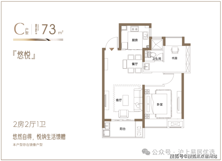 73㎡悠然两房格局方正,布局合理,73㎡的面积设计有一卧室、一书房、一餐厅、一客厅、一厨一卫还带一阳台,满足日常生活所需,且空间充裕不显拥挤,这个户型本批次只有两套,真正的手慢无!