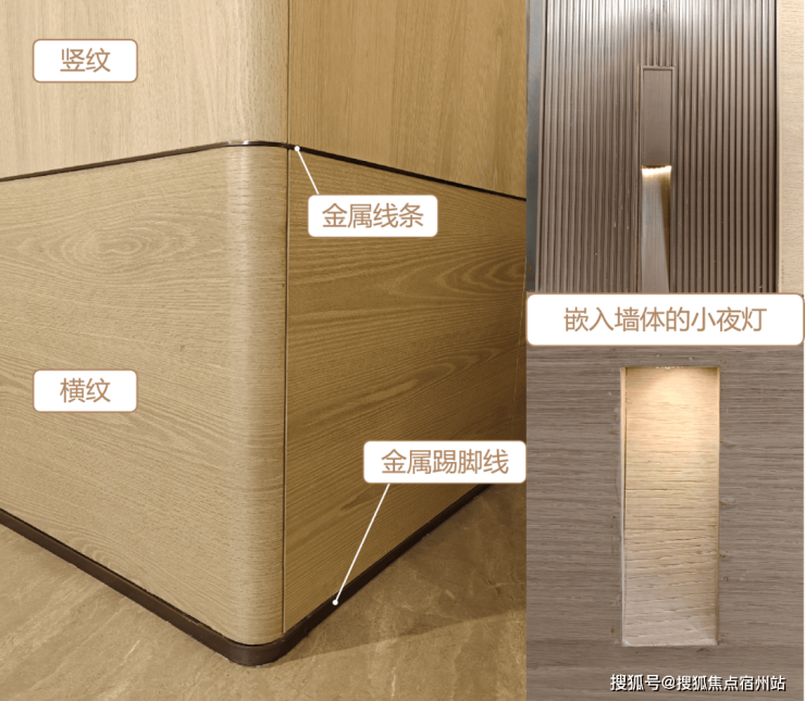 木饰面用上下不同的纹理表达,以及嵌入金属线条,整个墙面灵动而极具艺术氛围。