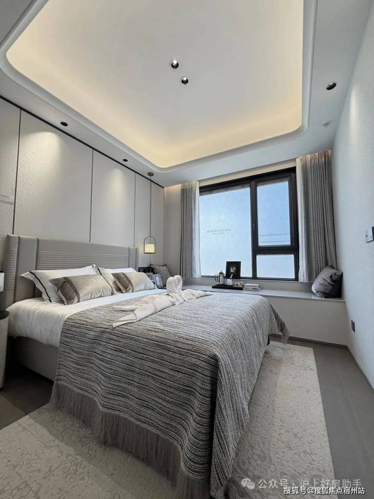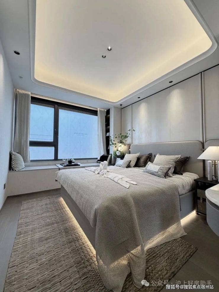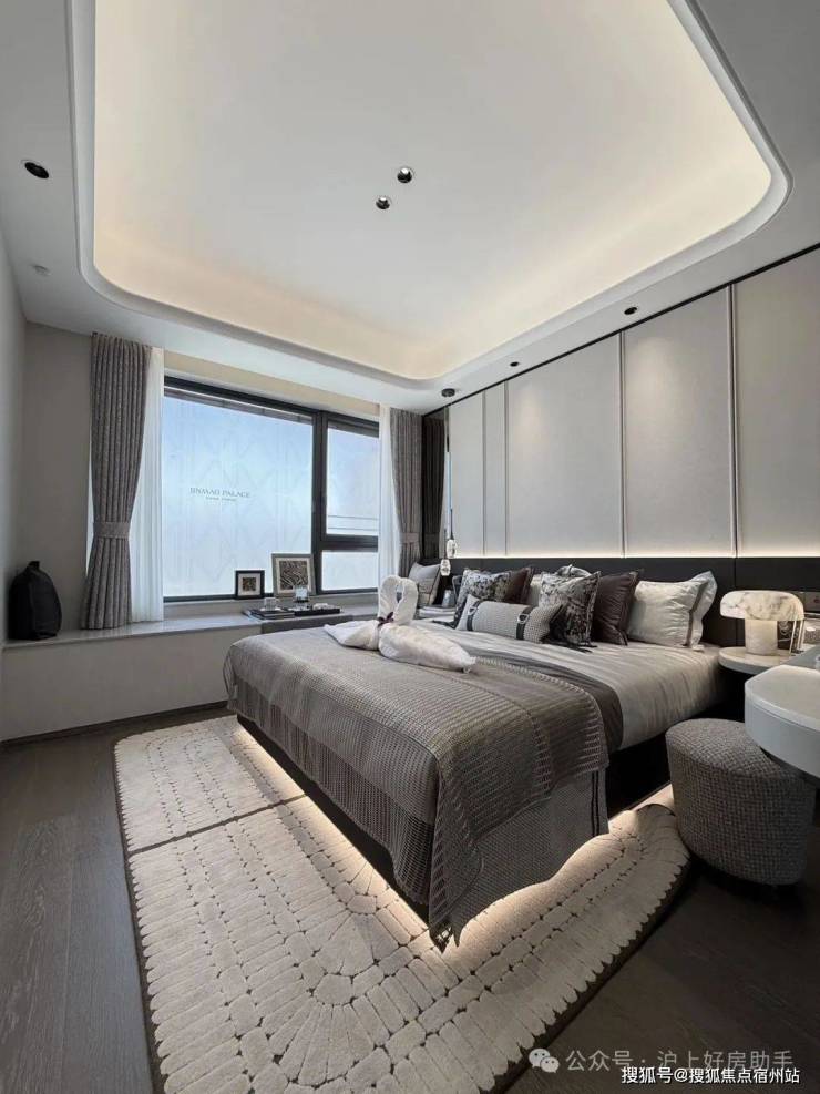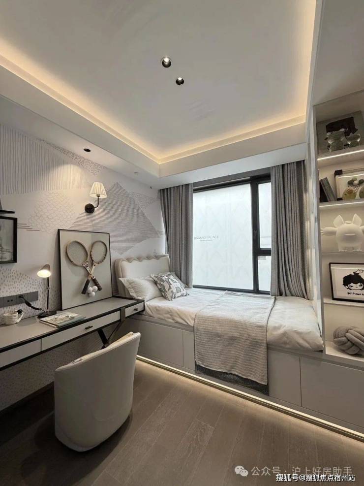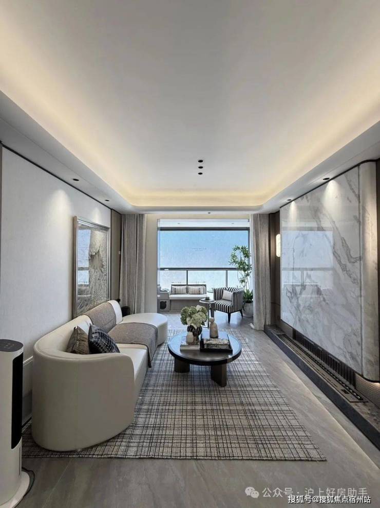 悬浮式弧形吊顶像给天花板开了美颜滤镜,配合无主灯设计,光线柔和分布,给予视觉与心理的舒适体验。