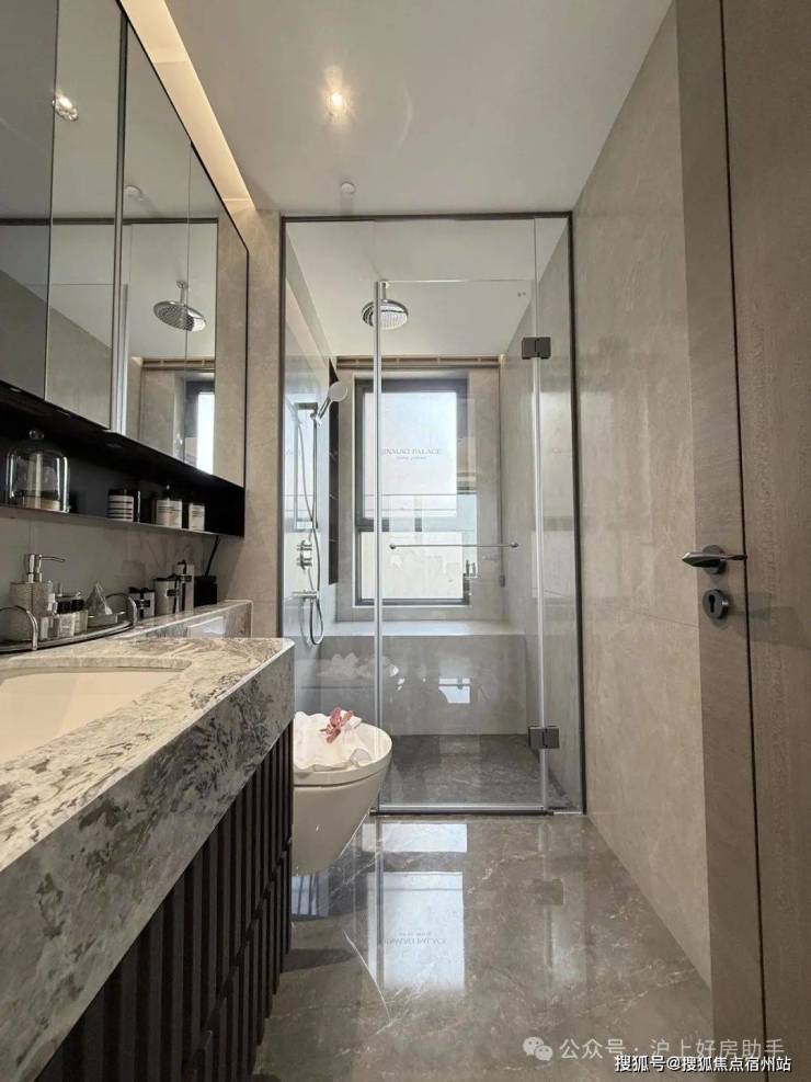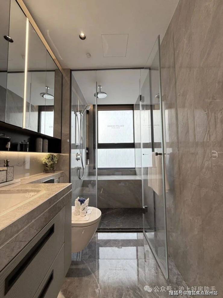 卫生间同样毫不逊色, 高端卫浴品牌杜拉维特的台盆、壁挂智能马桶,高仪的龙头、淋浴花洒,一应俱全。