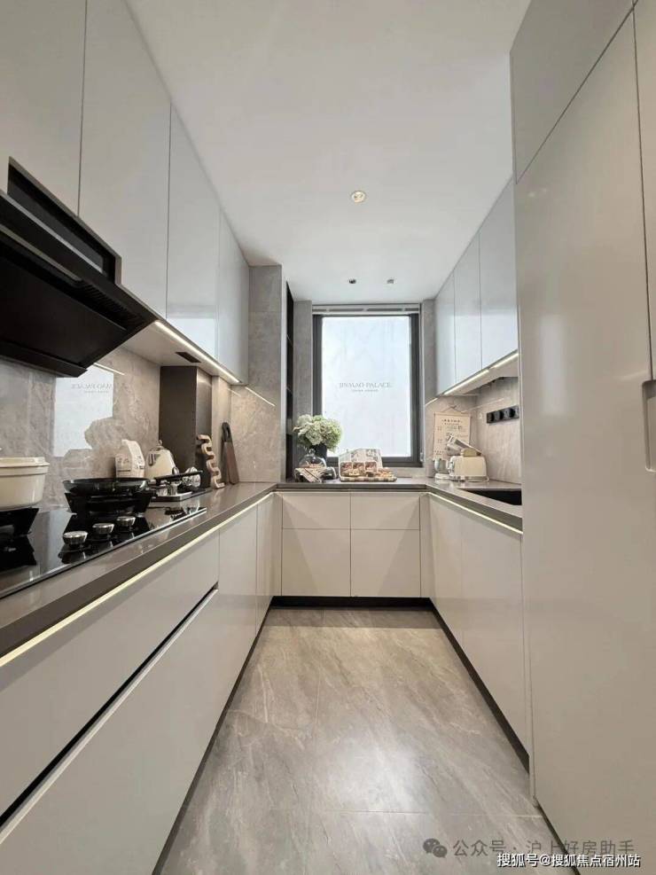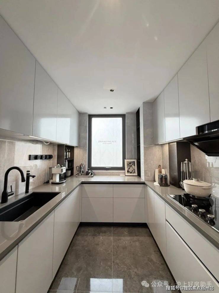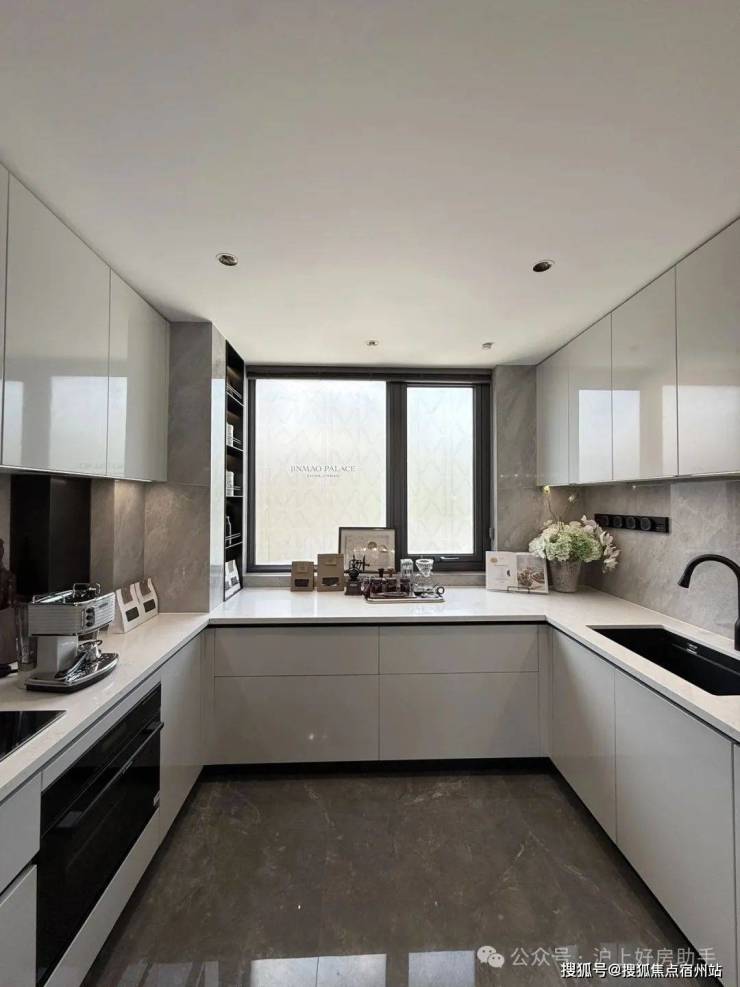 博世的燃气灶、油烟机、洗碗机三件套,摩恩的水槽、抽拉式水龙头,高尖直饮水净水系统和厨房收纳系统一个不少。