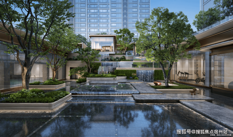 项目以外滩精奢酒店&江湾蓝绿臻境为灵感,打造 三重台地悬瀑自然庭院!