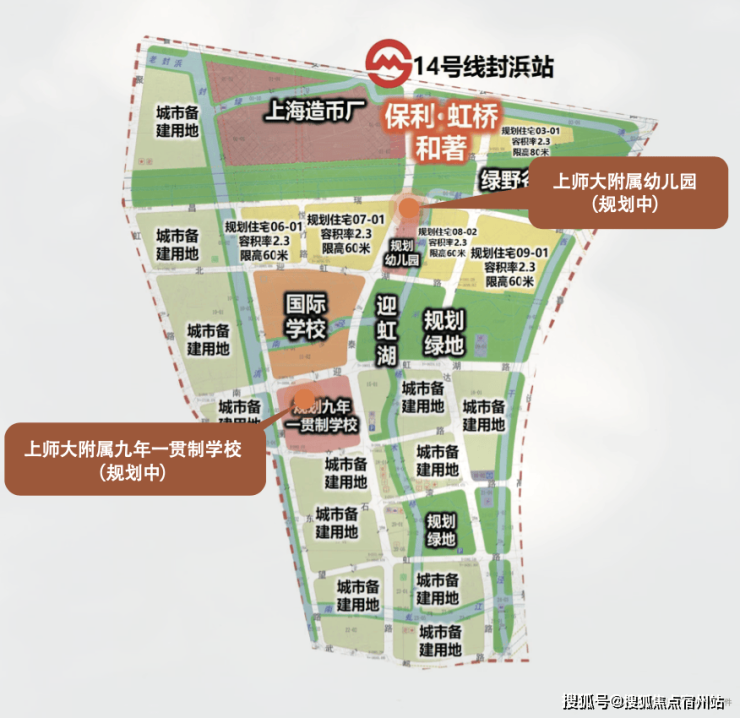 轨交:地块与地铁14号线终点站封浜站的直线距离不到500米,坐一站到乐秀路,未来可以换乘嘉闵线(在建),连接大虹桥、七宝、春申等板块。