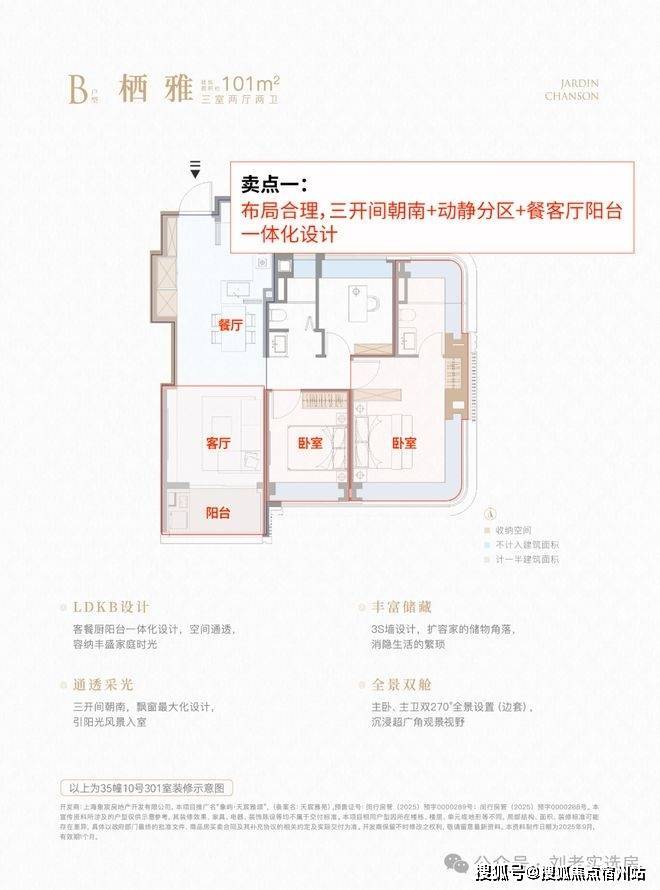 建面约101㎡边套户型,首先布局相当合理,三开间朝南+动静分区+客餐厅阳台一体化设计,采光、私密性和空间利用率全部拉满,3房2卫的配置也非常符合市场主流需求。其次,大量S墙的设计简直见缝插针,极大的扩容了家的储物角落,消减了业主生活的繁琐。