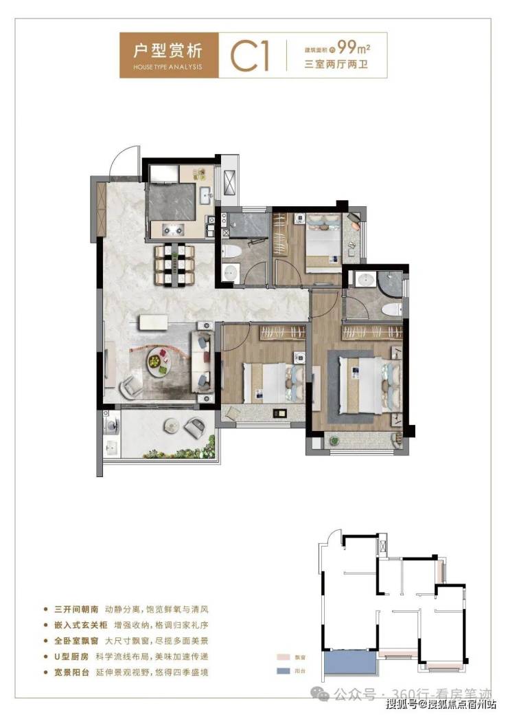 · 85㎡三房:三开间朝南,全卧室飘窗设计,拥有超大赠送面积,得房率高。全明双卫,主卫也附带飘窗。