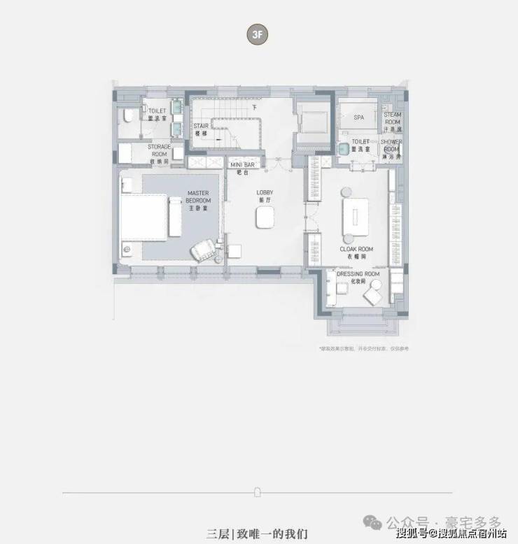 三楼整层为主卧套房,样板间设计了双开门入卧室,进入起居空间,样板间选择在这里放一些艺术装饰、设计吧台来彰显主人品味。