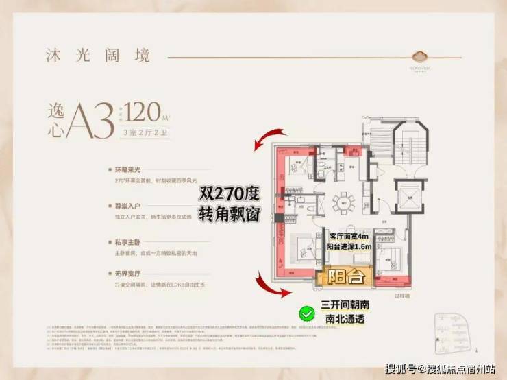 部分楼栋的120㎡户型做了类一梯一户的电梯厅设计。三开间朝南 + 南北通透 + 飞机户型,空间奢阔大气,是非常标准的一个改善户型。