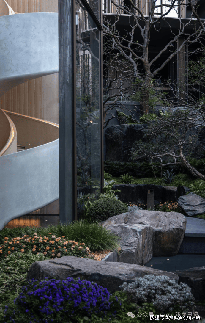 近2000㎡下沉庭院:玉扣绿岛、风籁禅境、登云之梯等多重景观共融,开创上海惟此山川溪谷立体庭园