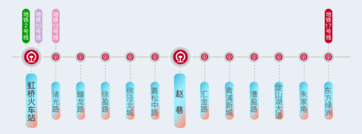 17号线6站直达虹桥枢纽,无缝换乘2号线、10号线,快速通达中山公园、静安寺、陆家嘴等传统市区核心商圈。此外,17号线沿线每一站均为TOD商业中心,虹桥天地、龙湖天街、蟠龙天地等约220万方商业体量环绕,为业主提供吃喝玩乐购的一站式都会生活体验。