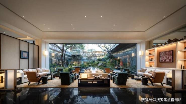 步入其中,眼前是一幅由整幅大玻璃窗映照的自然画卷,外侧曲水流觞,自然之美尽收眼底,而室内则透露着隐奢生活的气息,这种对比营造出一种强烈的视觉冲击和美感。