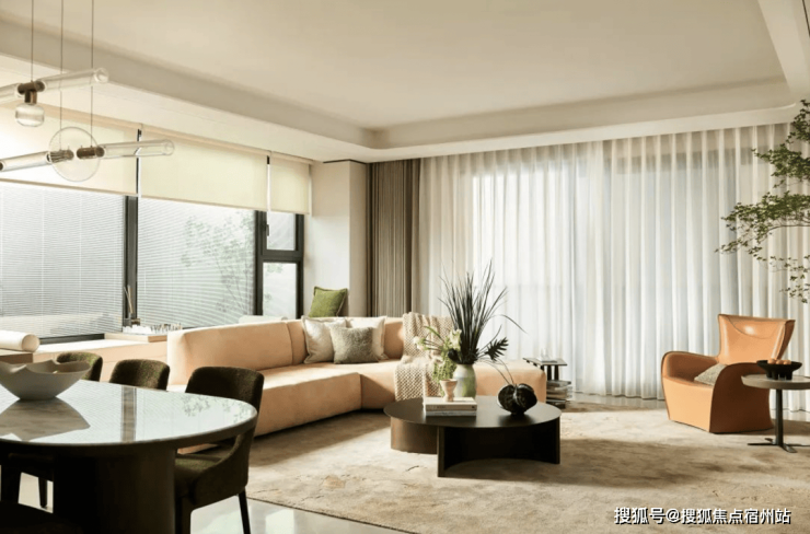 室内设计,秉承摩登东方的理念,设计以人、生活为中心,从空间本体和情感层面都回归生活,270度环幕采光,开放式会客厅设计,兼具尺度感与功能性。