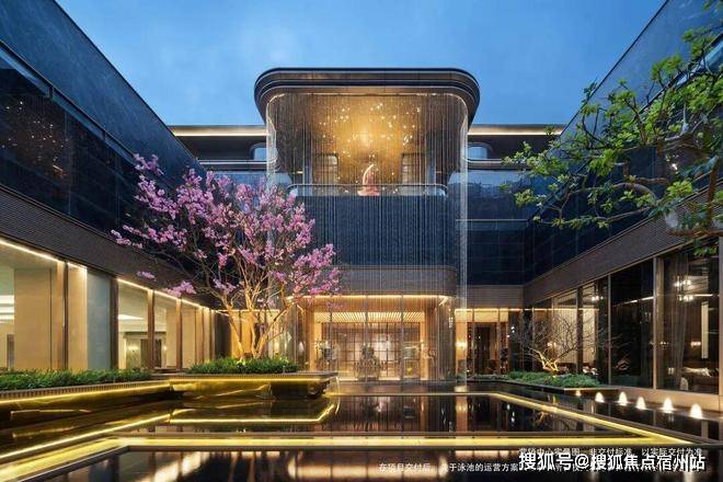 下沉式环幕庭院,跌水景观环绕,池底仿黑金砂与宝石晶片闪烁,点缀百余灯珠,师法“琉璃水光” 形意,糅合视听五感,打造全浸式立体园境,天工巧夺,嘉定未见。