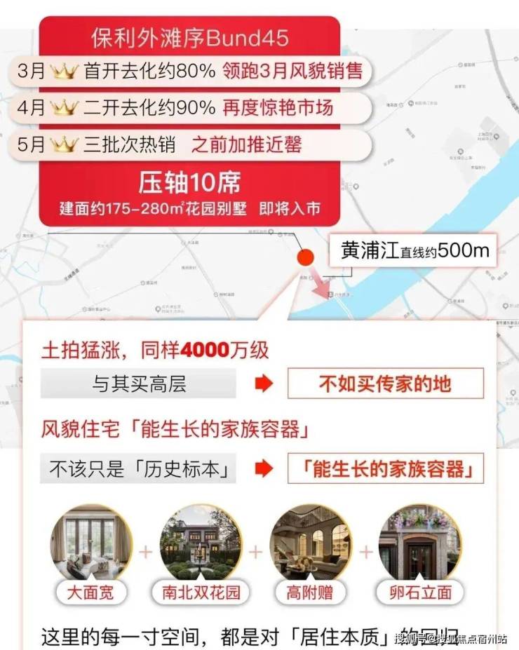 杨浦滨江风貌带全新供应,约500米滨江+臻稀风貌+超级花园,保利·外滩序BUND45在首开去化约80%,领跑3月全上海风貌销售榜后,保利·外滩序Bund45风貌于4月再度入市,去化约90%。