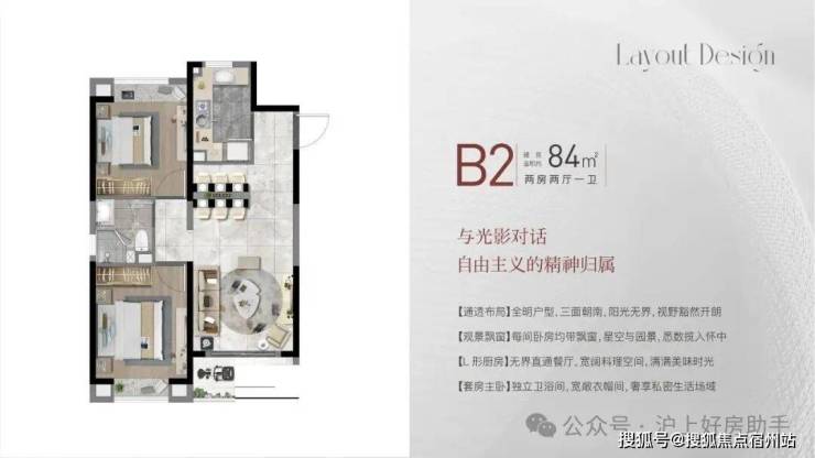 建面约84㎡2房2厅1卫,做到了 双开间朝南+双卧室带飘窗+动静分离,非常宽敞的2房户型。