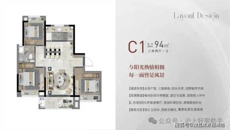 建面约94㎡3房2厅1卫,做到了 三开间朝南+双卧室带飘窗+飞机户型,室内通透明亮;全屋通风。