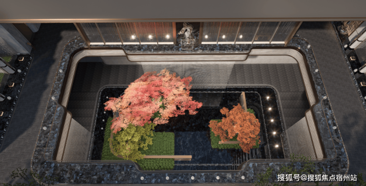 下沉庭院整体长约18米,进深约9.5米 ,庭院的上下景观通过水帘相连通,中间结合有着层层叠水的水景,搭配水晶砖的景墙,将品质感拉满。