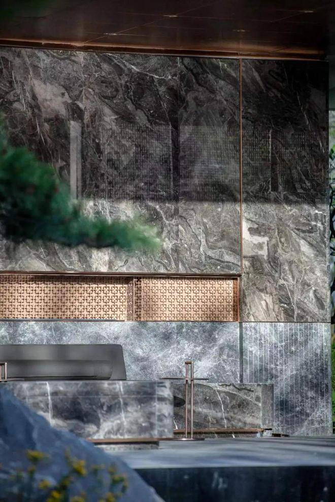 位于社区中央的第二景观会客厅聆星客厅,立面装饰有极具典藏价值的 威尼斯棕奢石、吊顶采用铝板切割镶嵌、地面采用 阿尔卑斯灰和福鼎黑拼花铺装。