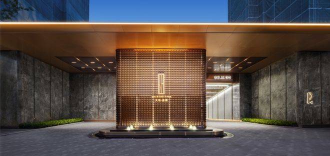地上大堂,单元门厅的 雨棚采用香槟金的弧面铝板、立面干挂爱马仕灰蜂窝岩板,岩板上嵌入专属楼栋号,单元门两侧的弧线段金属采用定制模具加工。