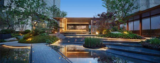 聆星客厅前方种植了松界王者—— 日本黑松,约4000万+的顶豪融创外滩壹号院的社区内,也有一颗同款;