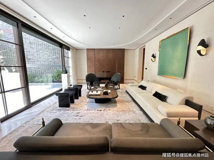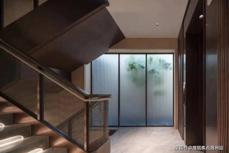 整个泳池天花板,呈现出海派拱形元素,落地玻璃窗外,是下沉式的景观空间: