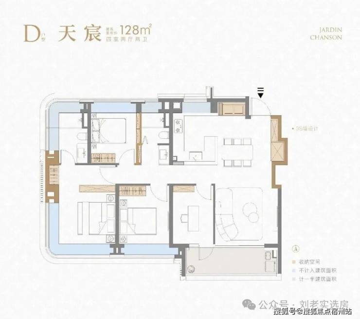 建面约128㎡户型则是做到4房2卫的功能性,适配市面上越来越多的二胎或三代同堂家庭。格局上进化为南向四开间,保证了更充沛的阳光。客餐厅+超大尺度阳台贯穿南北,进门视野无遮挡,大宅气度油然而生!