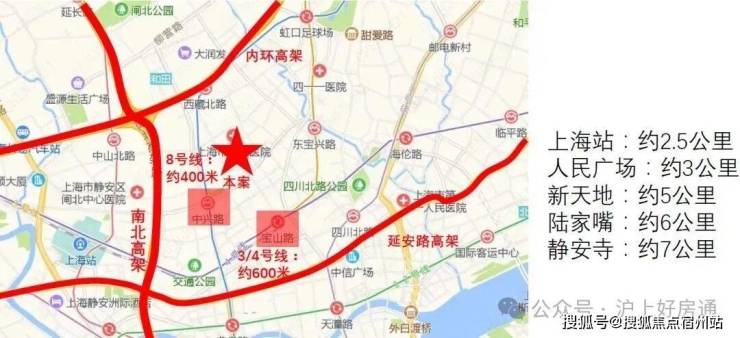 自驾方面: 项目毗邻南北高架、内环高架,距离南北高架永兴路口仅500米,可快速到达苏河湾、人民广场、陆家嘴、静安寺等多个市级商圈,出行便利。