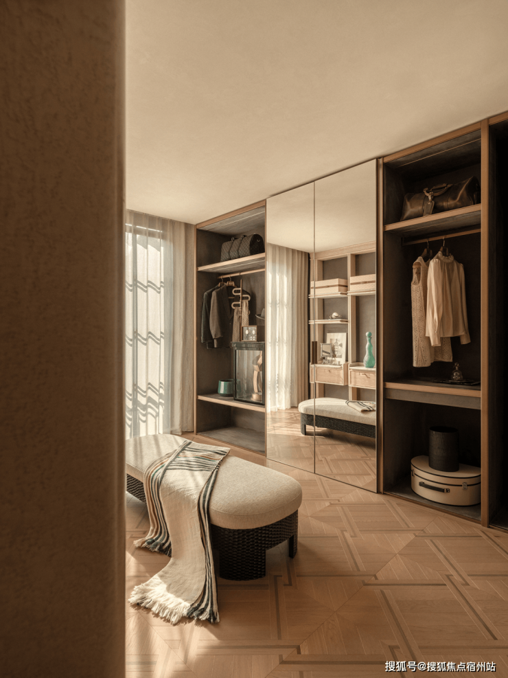 主卧床屏后结合屏风与窄床背,以对称形式建立空间的秩序骨架。