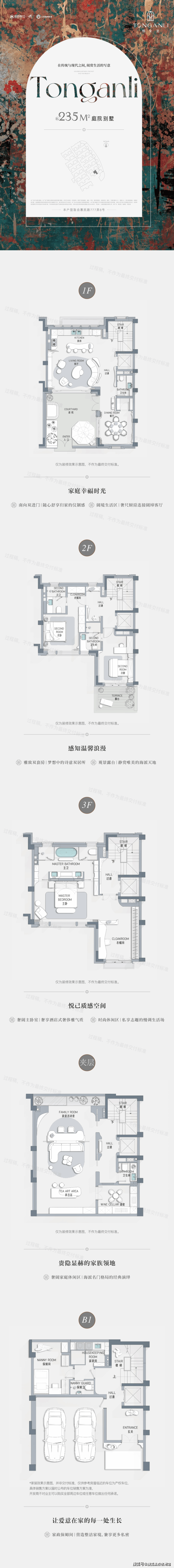 整盘仅有70套住宅,以建面约235-305㎡风貌联排别墅为主,搭配少量建面约185㎡叠加产品!