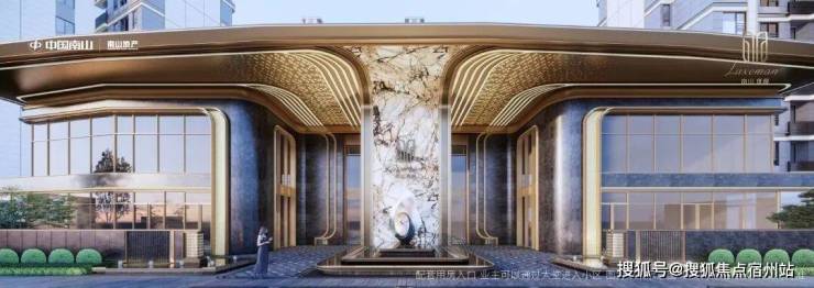 墙体采用雪山蓝石材,搭配香槟色铝板,普拉达绿石材、安哥拉黑石材、真石漆保温一体板与大面积落地玻璃,叠水小品迎宾启幕归家礼序。