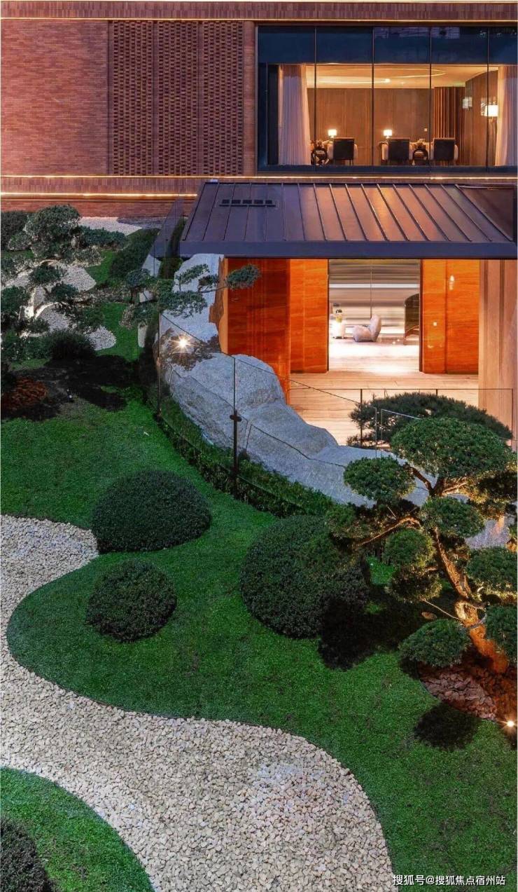 山水庭院汲取《足立美术馆》的造境手法,以老石皮、百年古木原样搬运,重现山间岁月的自然痕迹,与庭院中的光影交织,仿佛将山间的自然采光与静谧之感搬入城市。阳光透过树梢洒落,石皮上的纹理在光影中若隐若现,宛如一幅流动的自然山水画卷。