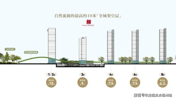 全域架空层,最高达10米,将社区生活平面整体抬升,隔绝尘嚣,营造真正的“悬浮社区”;规划建设人行天桥,直达大宁公园绿地,取之自然,打造无界绿色大宅。