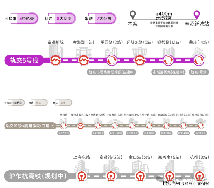 轨交网络:5号线、15号线南延伸段(在建中)、市域嘉闵线南延伸段(规划中)、沪乍杭高铁(规划中)及南枫线(在建中)