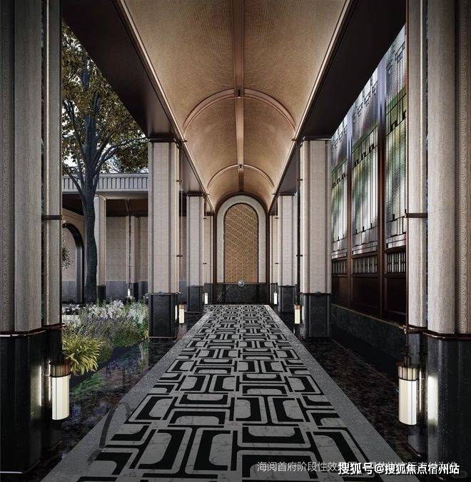 继续向里走,廊道内可见经典的石材立柱、拱形的吊顶、✅✅建发海阅首府售楼处电话:400 - 8824 - 258✅✅PRADA荣宅的手绘彩玻、繁花的地面拼花等用材工艺,移步异景间,是别样的摩登魅力。