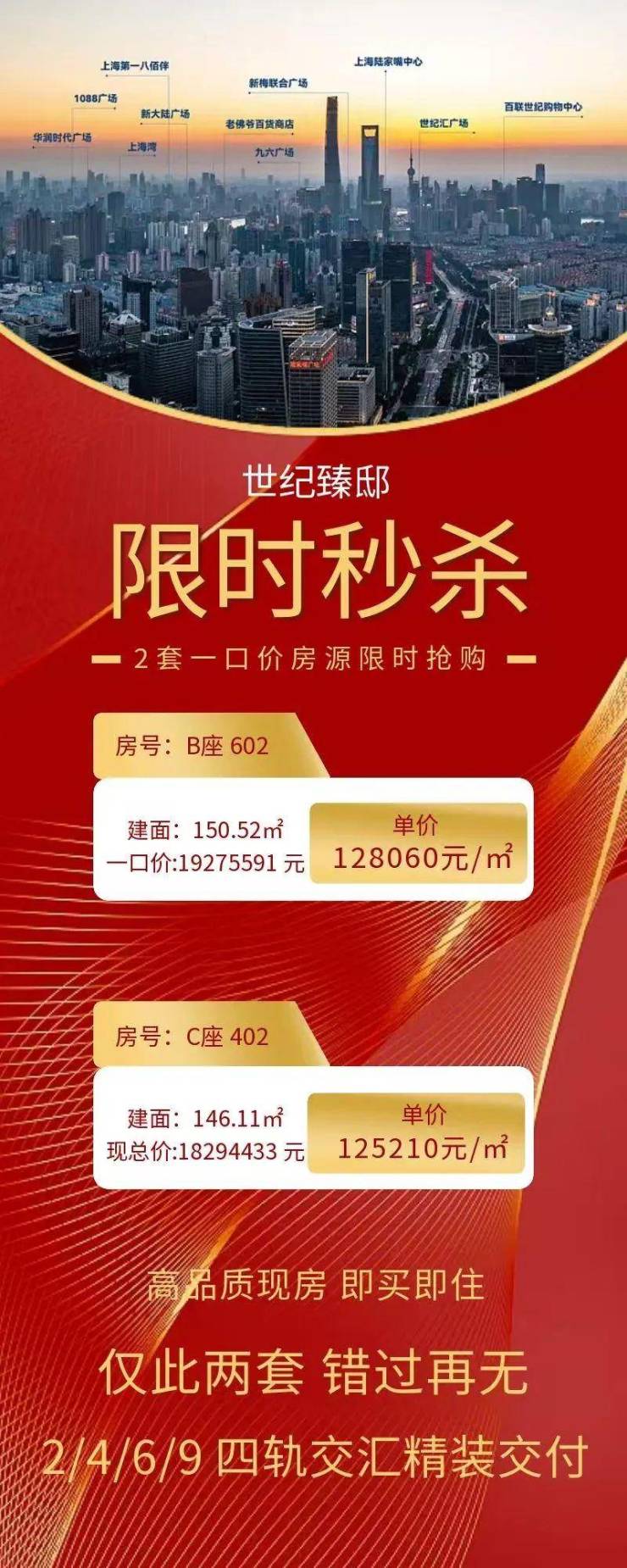 世纪臻邸最新消息,世纪大道站「世纪臻邸」最新户型图发布!建面约109-261㎡3-4房,直接认购!陆家嘴现房+95折+送车位!陆家嘴太古源!目前售罄第一批次:2024年12月15日 1.2号楼 50套 均价:16.9万/平米 触发积分 五年限售,世纪臻邸价格才12.5万/平,还有95折优惠+送车位真是在陆家嘴地区打着灯笼也找不到了!☑️☑️世纪臻邸售楼处电话:400-1183-605☑️☑️