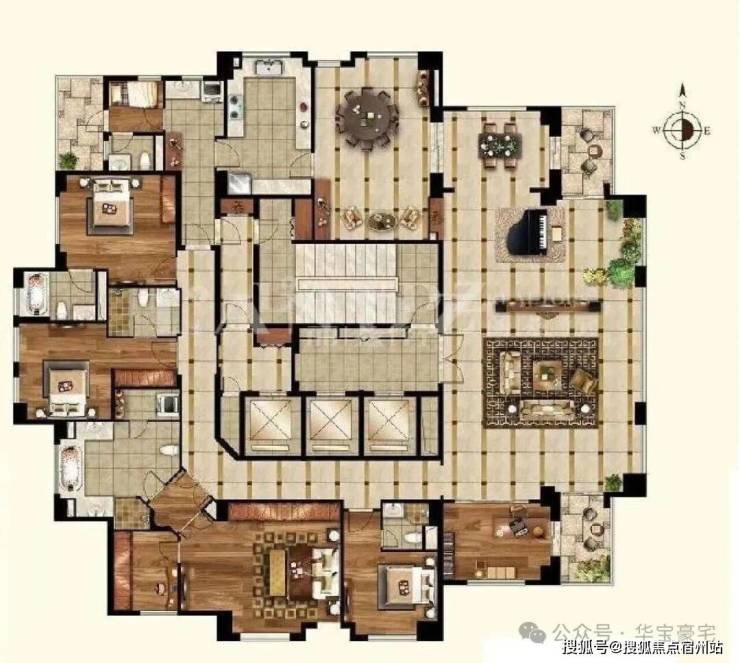 整个户型呈现“回”字型,寓意回家,四周是功能区,中间是三部电梯,其中两部是主人电梯,从东向客户入户,一部阿姨电梯,从西边阿姨间的位置入户。