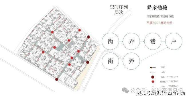 士林润园社区规划可分为蓬莱路城市公共景观以及社区内部景观两个部分,其中市政绿地衔接于上海2035城市总体规划中“蓝绿丝带”的上位条件要求,社区内部街巷空间形成空间序列形成递进的层次,将归家体验的序列依次展开,形成城市街道→入口(一级门户)→街巷→节点空间→里弄门(二级门户)→合院入户(三级门户)的方式,基本可保证大多数住户可体验到两重以上的空间递进。