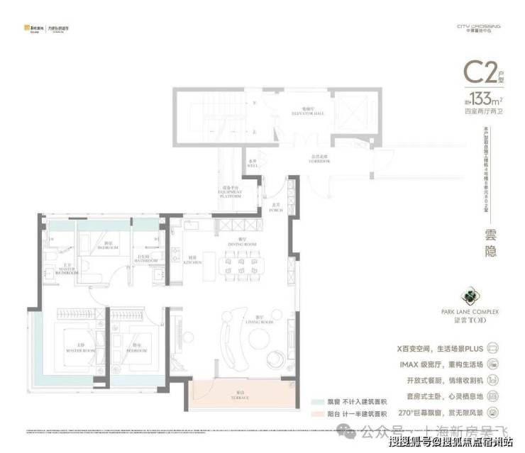 比如某项目通过半赠送L型阳台、全赠送露台,整个室内赠送面积就达到了55平。同时将阳台全封闭起来,光是客餐厅面积就达到了120平,还多出了一个茶室,得房率惊人。