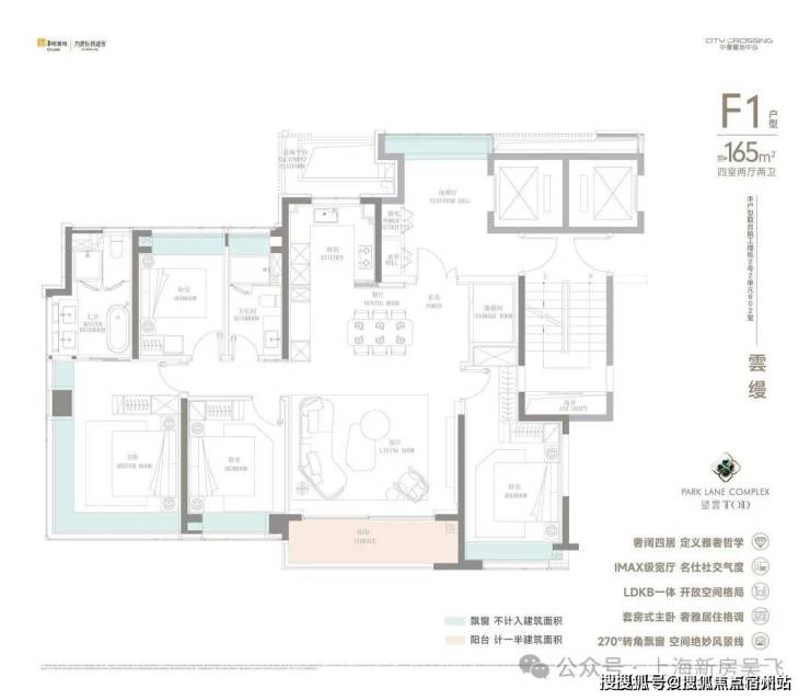165㎡四房两厅三卫:横厅设计,客厅面宽6.2米;主卧豪华套房,配备步入式衣帽间和独立卫生间;保姆房独立设置。卧室+双卫生间的全飘窗设计,主卧采用270°超广角飘窗环绕。