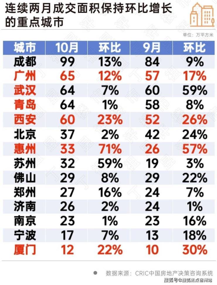 对比9月数据来看,30个重点城市中有14个城市连续两月保持环比增长,分别为成都、广州、武汉、青岛、西安、北京、惠州、苏州、佛山、郑州、济南、南京、宁波、厦门。其中,广州、西安、厦门、惠州连续两个月保持10%以上增长。