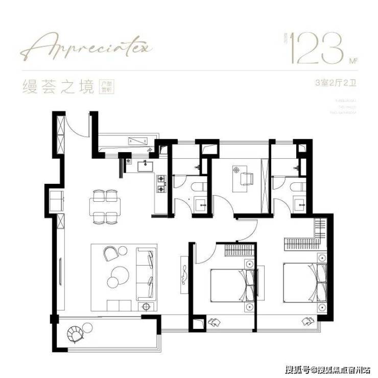 建面约123㎡3房户型,户型方正,三口之家的改善进阶之选!巧妙预留X空间,既可成为客厅空间的延伸,也可独立成室,实现更多功能想象。约12.5米南向面宽,搭配270°宽景阳台,窗外美景一览无余。