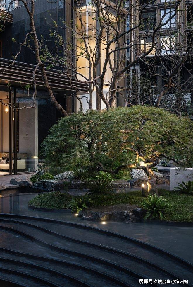 同时百年冬青撑开7.5米的华盖,186块乌金原石从太行山平移至此,银河流金奢石铺就的星河在水盘池底闪烁,仿佛将整片银河都收纳其中。