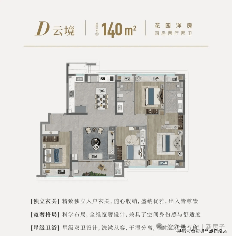 约140平方米4房2厅2卫,四开间朝南,通透敞亮;半开放式的U型厨房,空间感更开阔,切配更舒适便捷,一体化中西双厨设计,给予生活多一种选择,与家人分享多一种美味;