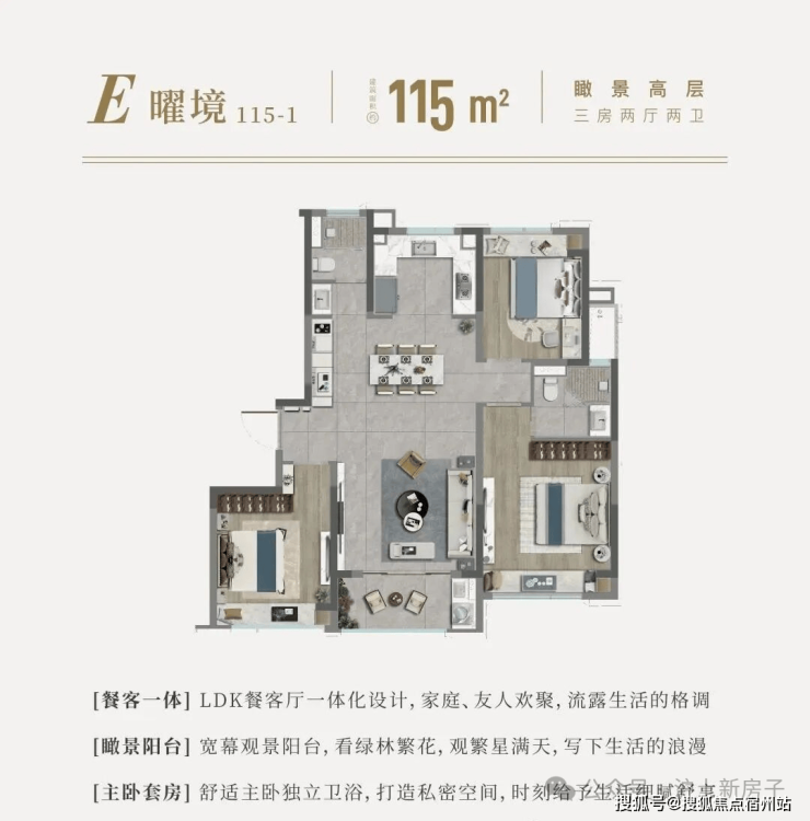 约115㎡3房2厅2卫,典型的“飞机户型”,同样餐客厅一体化,更宽敞的空间感;U型厨房,切配更流畅;卧室全飘窗,延展室内空间的同时,功能性更强;主卧套房设计,更私密、更舒适。
